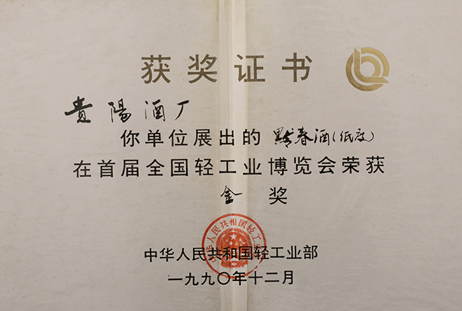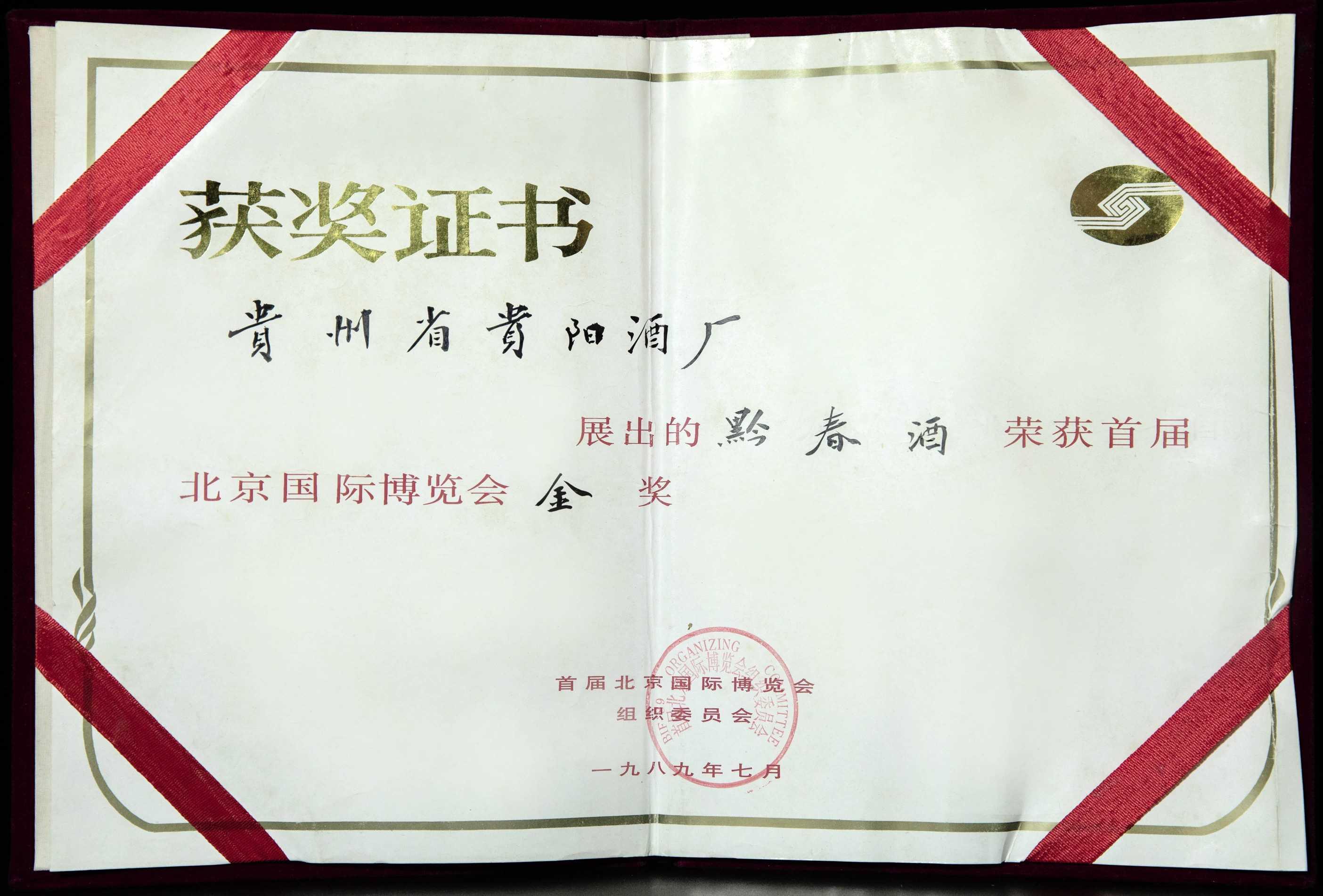 黔春酒——1989年首届北京国际博览会“金奖”